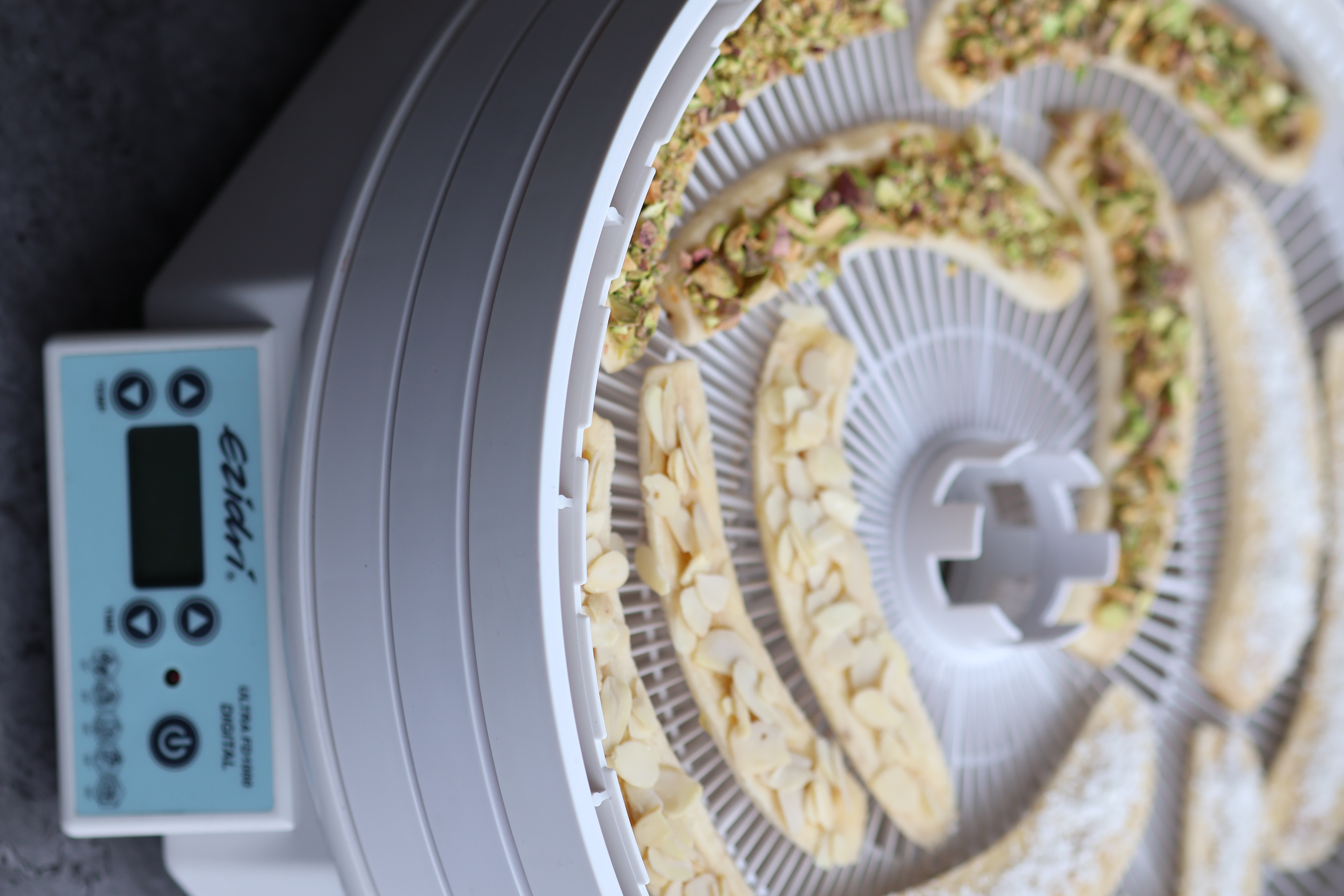 Nastavte teplotu sušičky na 55°C a zapněte ji na 16–20 hodin, aby se banány s medem a ořechy zcela vysušily.
